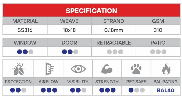 316 stainless steel flyscreen stands as the pinnacle of durability and protection against insects, reaching the BAL40 rating (Bush Fire Attack level), this makes it suitable for bush-fire prone areas and meets all council standards within this rating.